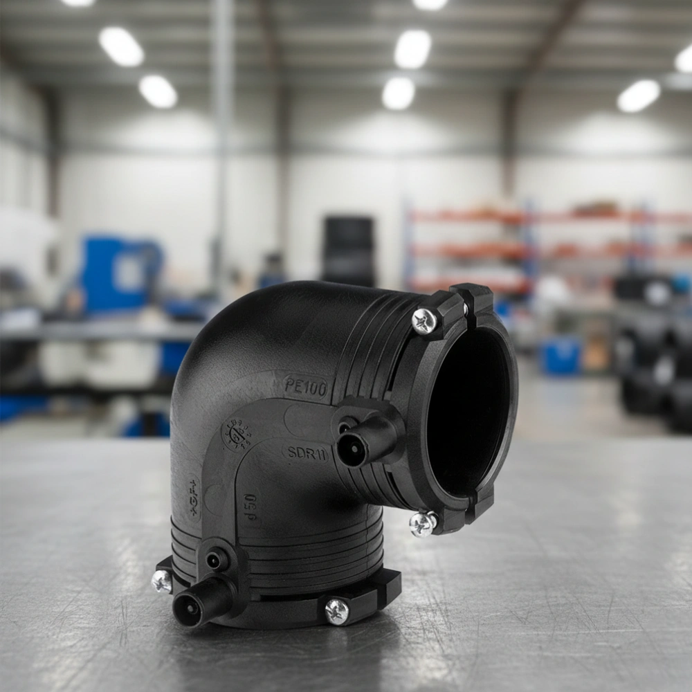 High-pressure 16 bar PE100 elbow with limited path fusion indicators for precision.